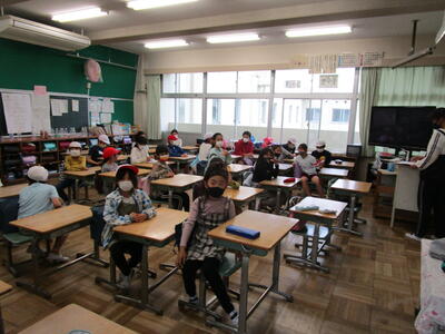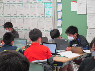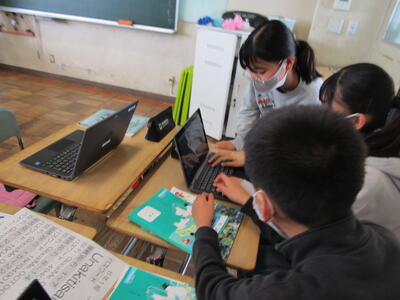 6年1組の理科の授業で、試験的に1人1台パソコンを使って調べ学習の授業を行いました。まだネットワーク工事が入っていない(6月に工事が入ります。)ため、ポータブルwifiをを使いました。ネットワークの接続が不安定で、なかなか思うような授業ができませんでした。