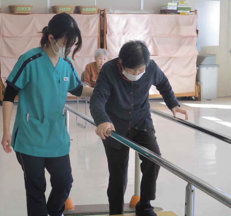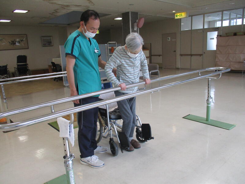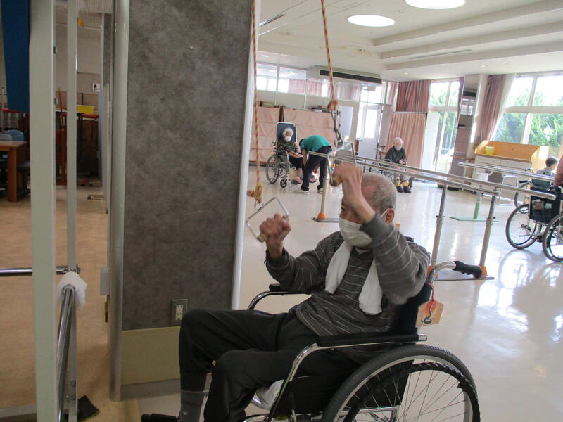 当施設のリハビリテーションとしては、「一人でトイレに行けるようになりたい」、「もう少し上手に歩けるようになりたい」などの具体的な生活上の目標があります。3名の理学療法士の指導のもと、基本的な運動訓練、応用的な生活訓練、また芸術やレクリエーション活動を利用した訓練などを実施しています。楽しく身体を動かすことで、機能の維持や改善を図っていきます。