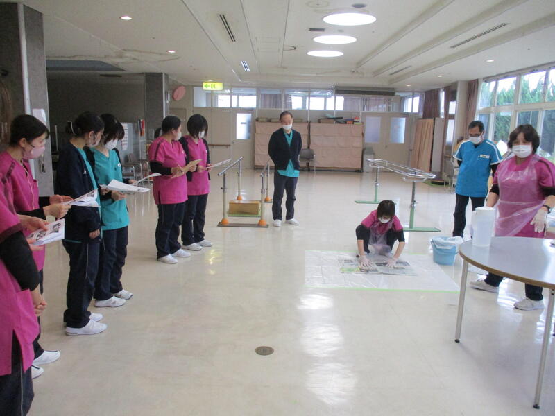 今回は、嘔吐物に見立てて処理の仕方を実践しました。