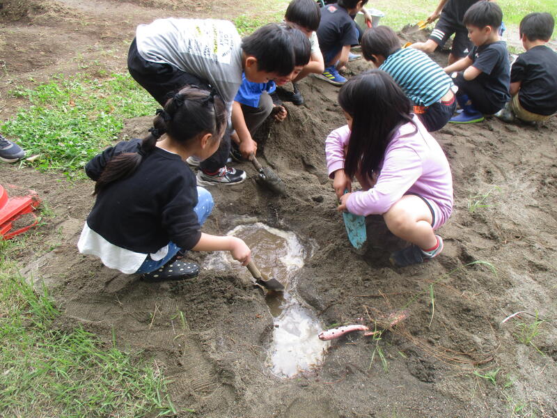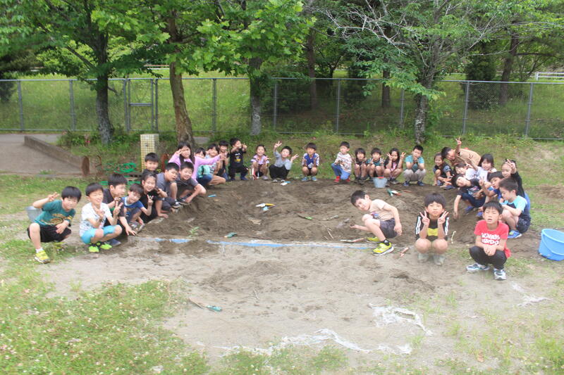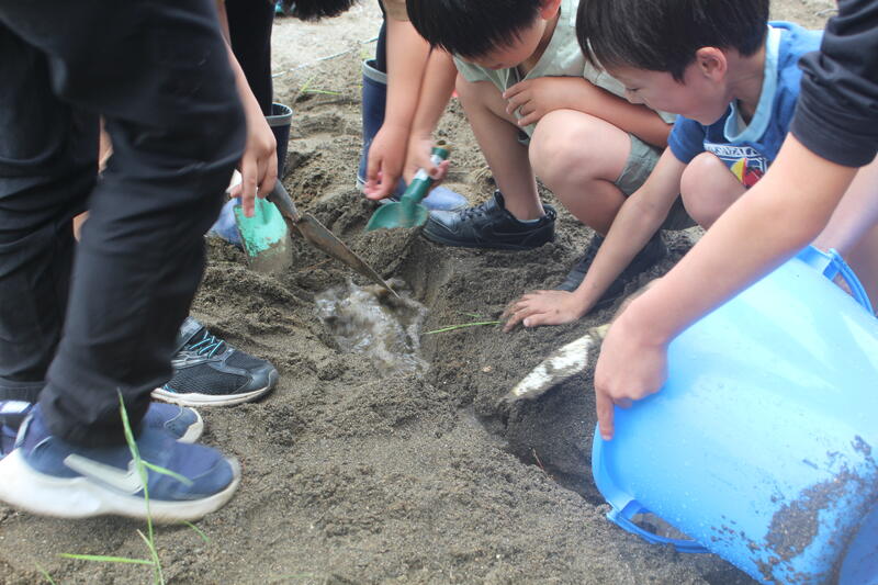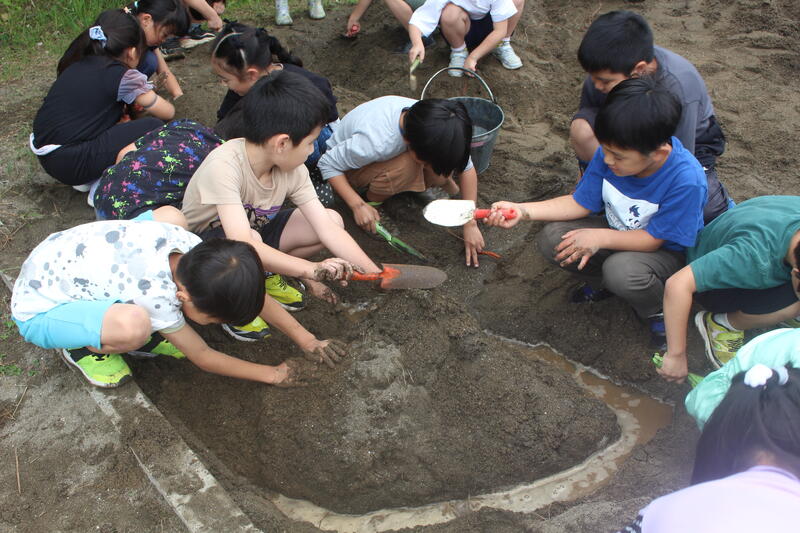 図画工作科「さらさら どろどろ」の学習で、造形遊びをする活動を行いました。砂場で、自分たちがつくれるものを考えて意欲的に活動に取り組んでいました。時間が経つと、子どもたち同士で声を掛け合い、みんなで大きな川をつくり始めました。個人の活動だけでなく、集団としても協力して活動に取り組む姿に感動しました。今後も、子どもたちの成長につながるよう指導していきます。