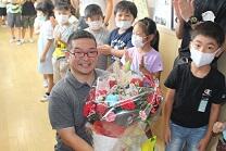 また、今年度末に転出されるお世話になった先生方とお別れする式(離任式)を行い、御礼の気持ちを込めて花束を贈りました。