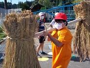 9月29日 5年生がこれまで育ててきた古代米の稲刈りを行いました。講師に古市さんを始め、5名のボランティアの方々にご協力いただきました。稲刈りのポイントを教えていただき、慣れない鎌で慎重に行っていました。刈った稲を稲縄で縛り、おだがけまで行いました。この後は、脱穀・籾すりを行う予定です。