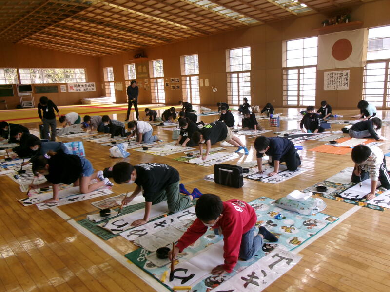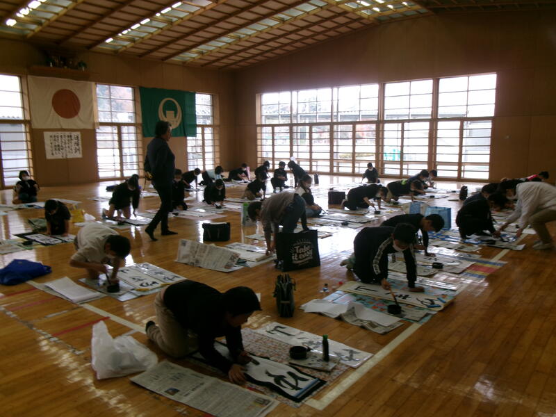 12月11日(木)の3、4時間目に尚武館で初めての書き初め練習を行いました。いつもの書写の毛筆とは違い、床に下敷きを敷いて、体全体を使って書きました。