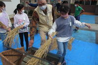 10月12日(水)、5年生が脱穀籾摺りを行いました。先日の稲刈りに引き続きすべて手作業で行いました。子どもたちは慣れない手つきでしたが、真剣に取り組みました。今回収穫した古代米は、来週の宿泊校外学習で使います。おいしく炊けるか今から楽しみです。今回も多くのボランティアの皆様がお手伝いくださいました。ありがとうございました。