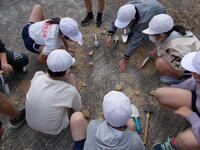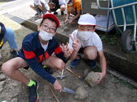 10月27日(木)に6年理科「土地のつくりと変化」の学習で、化石探しをしました。学区内にある地層から持ってきた岩石を観察し、金づちやシャベルを使い探しました。