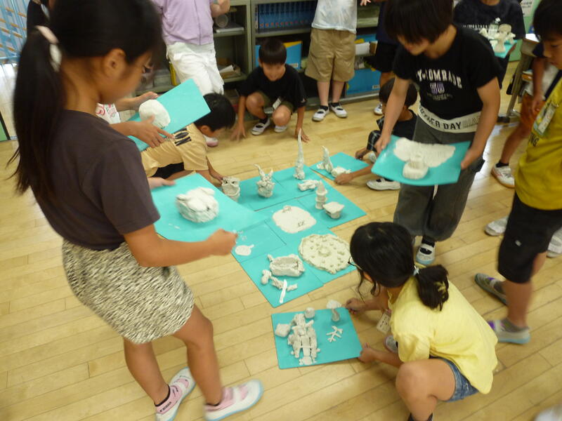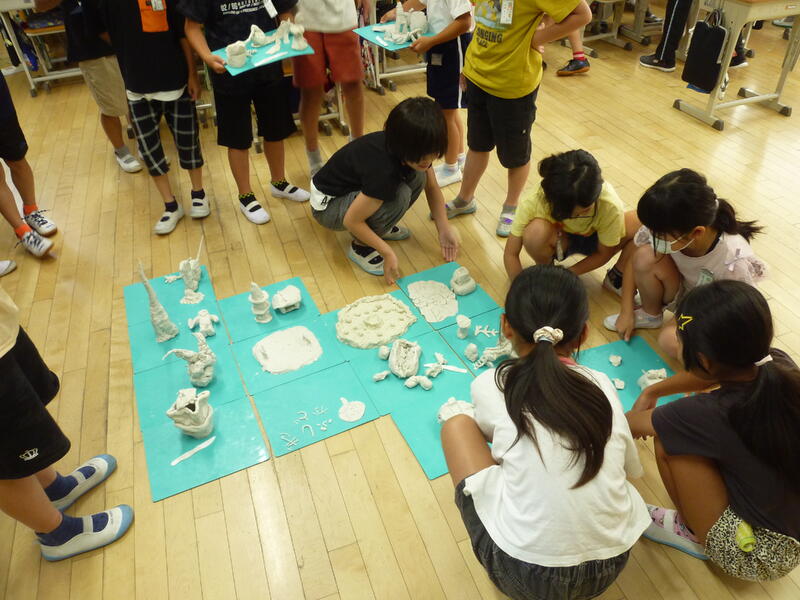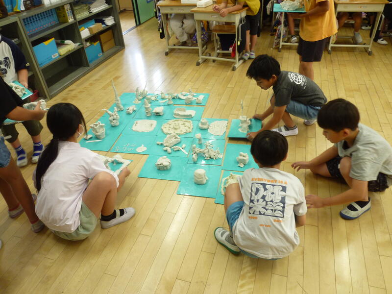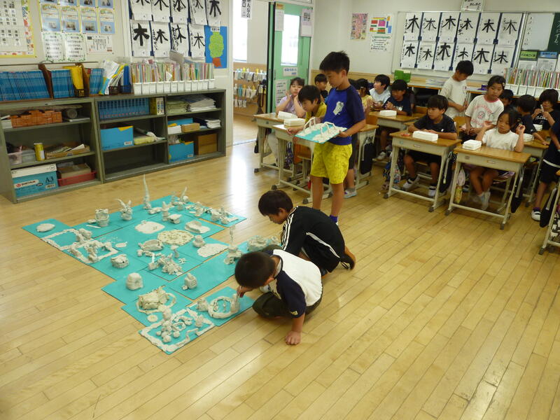 7月1日(火)、図画工作科の「みんなでつくろう ねん土ランド」で、一人ひとりが作ったねん土作品を合体させて大きな町を作りました。