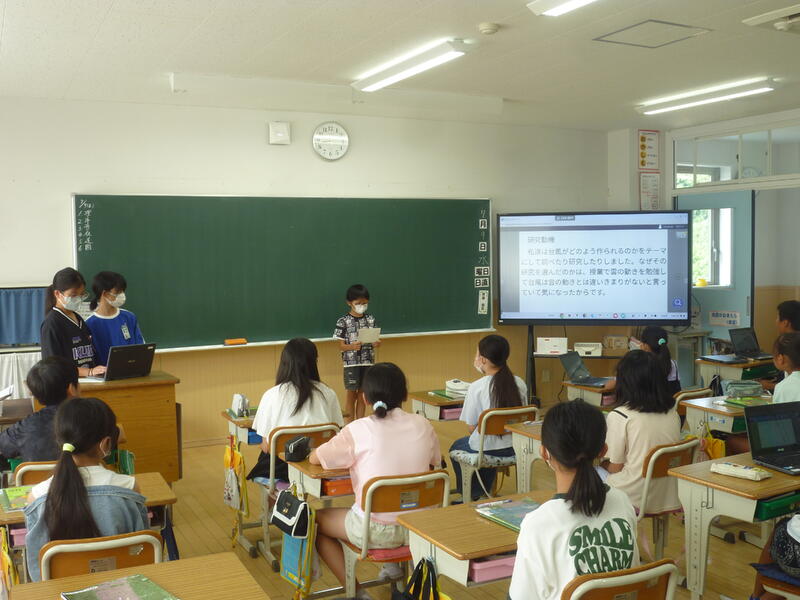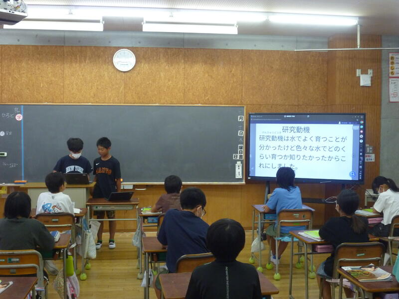 それぞれのグループで計画を立て、実験・観察、発表資料の作成、友達への発表まで協力して行うことができました。5・6年生にとって計画的に物事を行うことは、今後、様々な場面で活きていきますので、ここでの学習を夏休みや今後の学校生活に活かしていってほしいと思います。