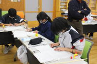 型紙にひごを貼りつけます。生徒たちも説明を真剣に聞き、一つ一つの作業を進めていました。最後には講師の先生から「100点満点」とのお褒めの言葉もいただき、この先の色付け、凧あげが楽しみです。
