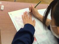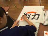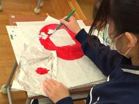 それぞれが考えた文字と図柄を描きました。台紙が和紙のため、色付けの際の水の分量に苦労していましたが、工夫しながら取り組んでいました。