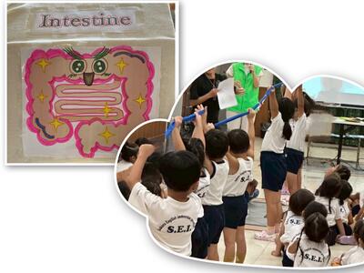 用意し、昨年の子どもの腸1本からバージョンアップし、長さの体験を行いました。