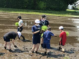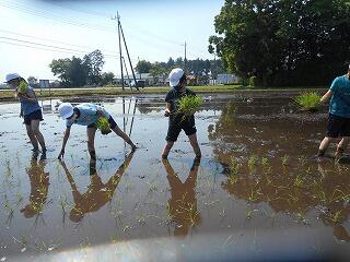 5年生は農事組合法人「農音」の方々に教わりながら、田植え体験をしてきました。裸足で田んぼに入り、泥の感触を楽しみながら苗を植えました。最初は泥に足を取られ、まっすぐ植えることに苦戦していましたが、だんだん慣れて上手に植えられるようになりました。田植えの楽しさや大変さを味わい、稲作についての関心が高まった様子でした。秋の稲刈りも楽しみです。「農音」の皆様、お忙しい中ありがとうございました。