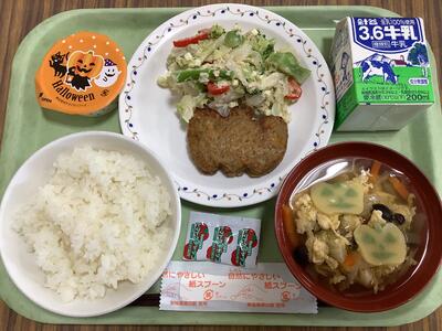 ごはん かぼちゃハンバーグ ブロッコリーサラダ 白菜スープ ハロウィンデザート 牛乳