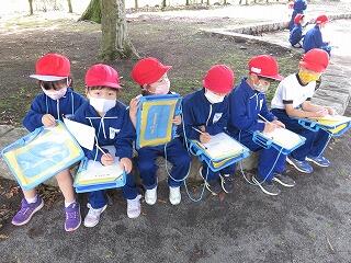 総合運動公園に着いてからは、見つけたものを絵に描き、遊具で遊びました。遊び場のルールやマナーを守り、友達と仲良く遊ぶことができました。