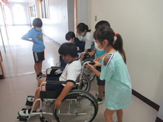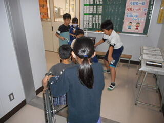 児童たちは、普段何気なく歩いている廊下を車椅子で時間をかけて移動しました。狭い通路や段差がある場所を移動することに苦戦していました。