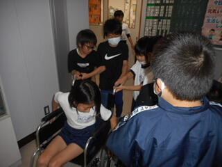 総合的な学習の時間に「福祉」について学習しています。今回は、車椅子体験を行いました。