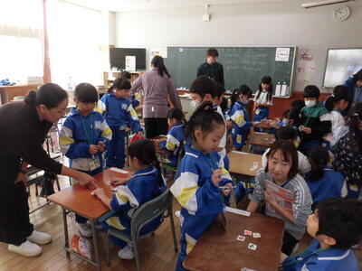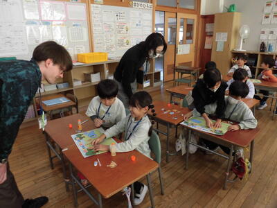 10月30日(木)、今日は、1・2年生のイングリッシュ・デイです。「オリジナルサラダをつくろう」(1年生)、「どうぶつパラダイスをつくろう」(2年生)の学習を行い、町のALT・JTEの先生方、友達との交流を楽しみました。