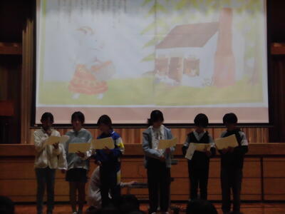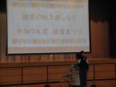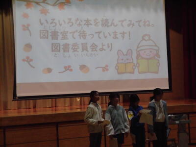 11月10日(月)、ロング昼休みの時間に、図書委員会による「読書まつり」を行いました。たくさん本を読んだ児童への読書手帳賞の表彰、図書委員による本の紹介、読み聞かせ・クイズなど、楽しい時間を過ごすことができました。図書委員のみなさん、ありがとうございました。11月4日(火)から14日(金)は、校内読書週間です。いろいろな本を読んでみてください。