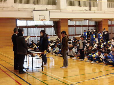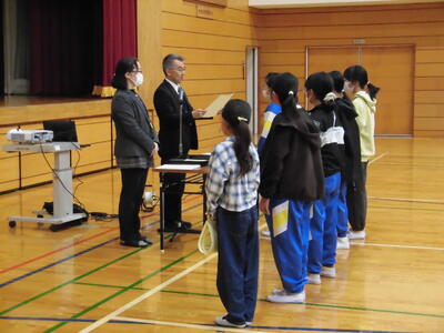 2年生と6年生の児童作文発表があり、児童指導主任からは「①時間を守って行動すること ②休み時間は、みんな仲良く楽しく遊ぶこと」との話がありました。