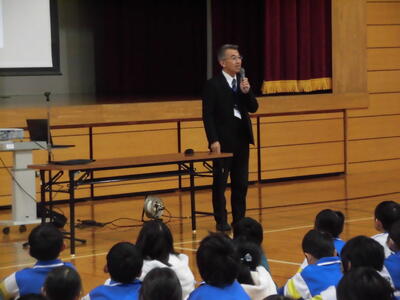 このあと、体育館に集まり、スクールサポーターや芳志戸駐在所の警察官の方からお話をしていただきました。