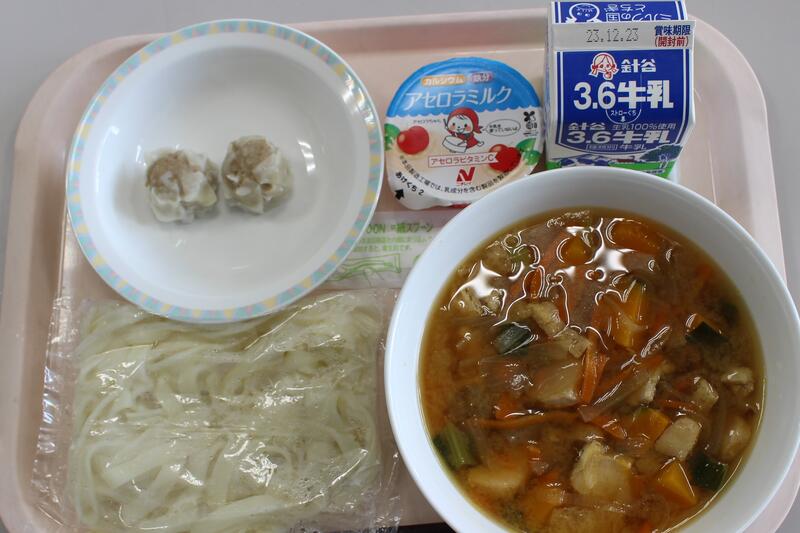ほうとう、牛乳、ポークしゅうまい、アセロラミルク
