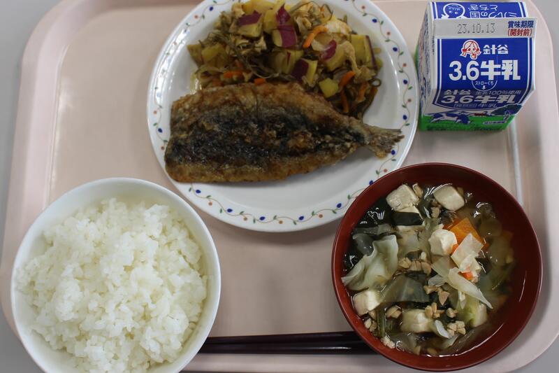 ごはん、牛乳、いわしのかば焼き、さつまいもと切りこんぶの煮物、みそ汁
