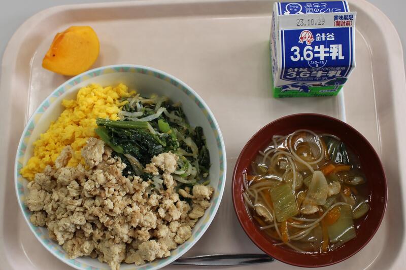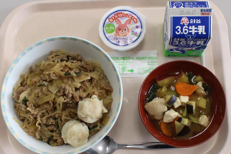豚丼、牛乳、みそ汁、芳賀町産梨(王秋 おうしゅう)