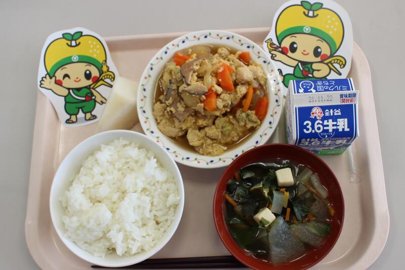 他人丼(豚肉と玉子)、牛乳、せんべい汁、ヨーグルト