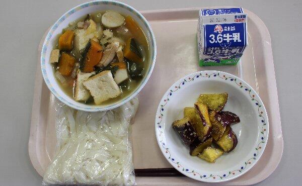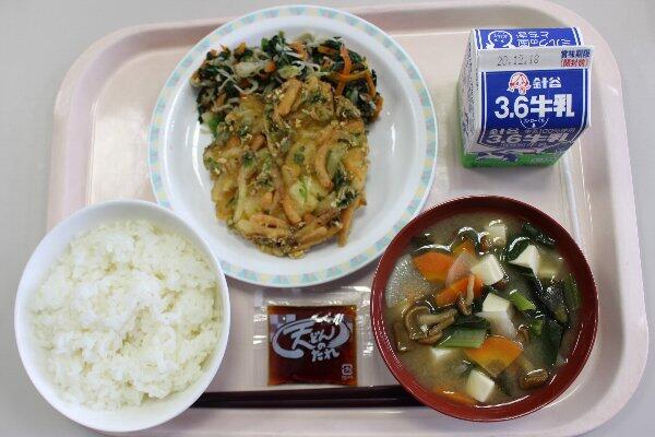 ごはん、牛乳、稚鮎の竜田揚げ、磯辺あえ、けんちん汁