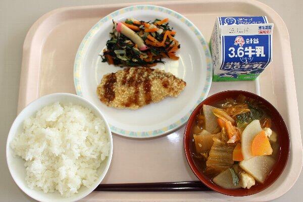 ごはん、牛乳、白身魚のサクッとフライ、野菜のあえもの、キムチ豚汁