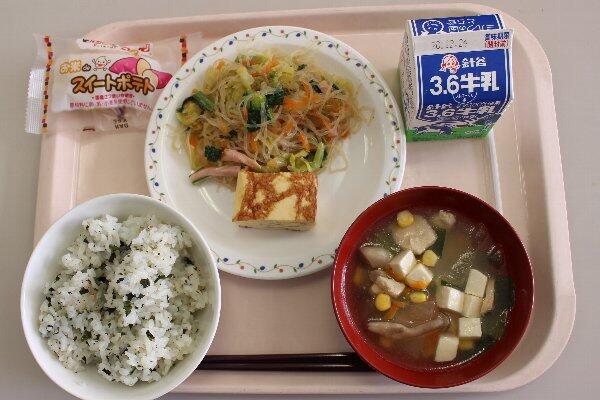 わかめごはん、牛乳、だし巻き玉子、春雨のあえもの、豆腐スープ、お米deスイートポテト
