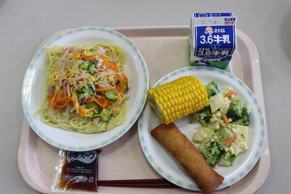 冷やし中華、牛乳、春巻、ブロッコリーとじゃがいものサラダ