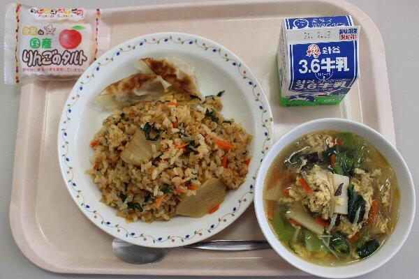 キムチチャーハン、牛乳、ぎょうざ、中華スープ、りんごのタルト