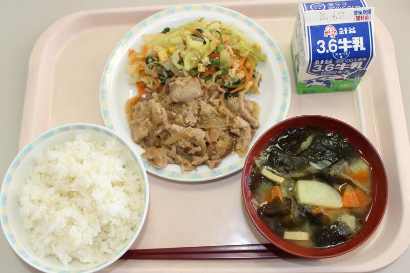 ごはん、牛乳、豚のしょうが焼き、野菜とコーンのサラダ、みそ汁