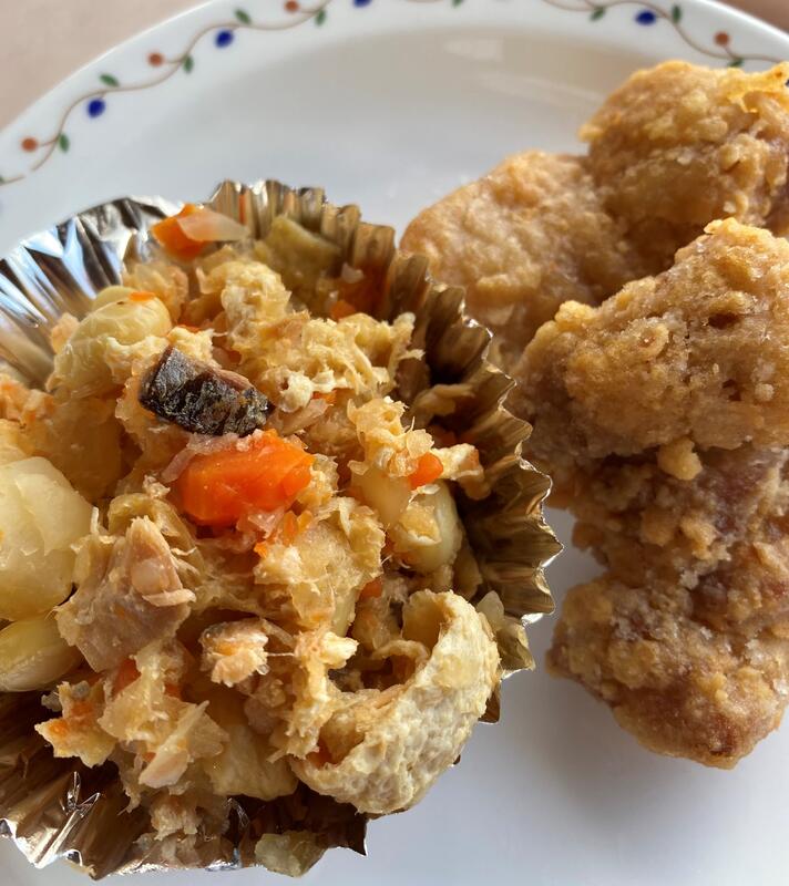 赤飯、牛乳、鶏のから揚げ、しもつかれ、かんぴょうの玉子とじ汁