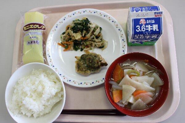 ごはん、牛乳、鶏肉のみそチーズ焼き、ごまあえ、ひっつみ汁、エクレア