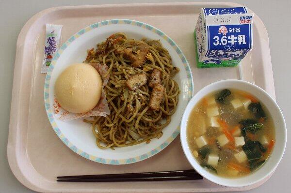 五目焼きそば、牛乳、ミニピザまん、中華風コーンスープ、かみかみこんぶ