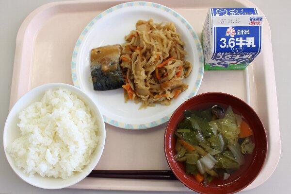 ごはん、牛乳、さばのみそ煮、切り干し大根の炒め煮、すまし汁