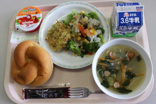 米粉パン、牛乳、パテチョコ、鶏のパン粉焼き、きのこのマリネ、野菜スープ、アセロラゼリー