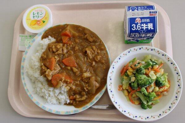 カレーライス、牛乳、ブロッコリーとチーズサラダ、アセロラゼリー