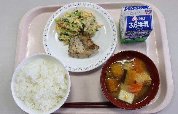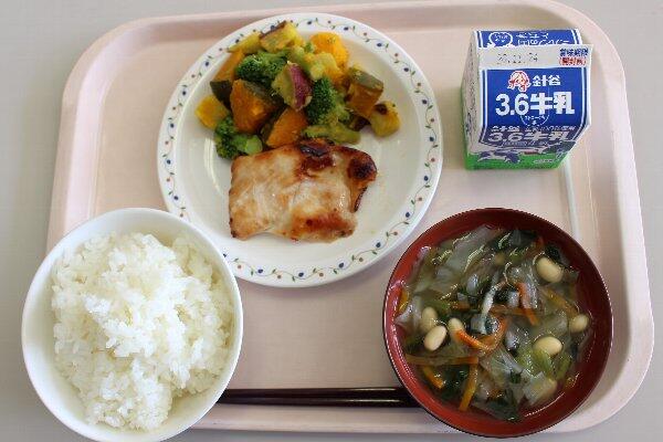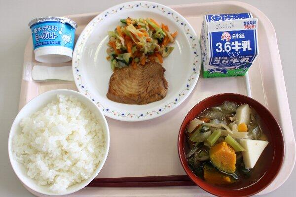 ごはん、牛乳、やしおますの照り焼き、かぼちゃのサラダ、どさんこ汁
