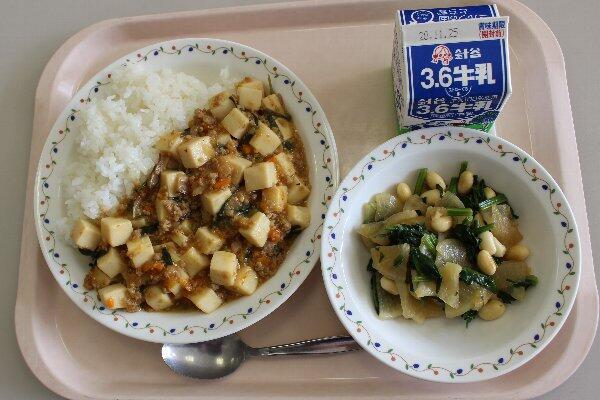 ごはん、牛乳、豚肉と大豆のみそ炒め、にらまんじゅう、塩けんちん汁