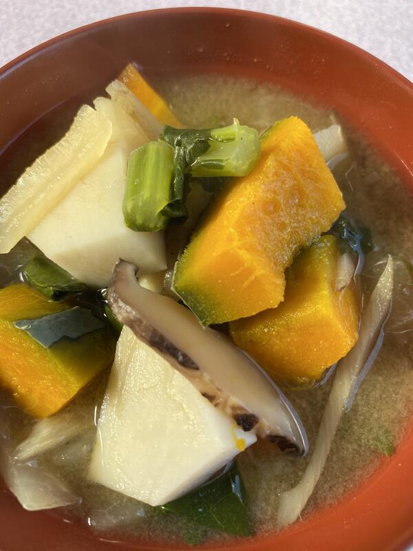 ごはん、牛乳、鶏肉の味噌風味焼き、かぼちゃのサラダ、野菜スープ