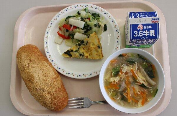 きなこ揚げパン、牛乳、スペイン風オムレツ、いかと野菜のマリネ、イタリアンスープ