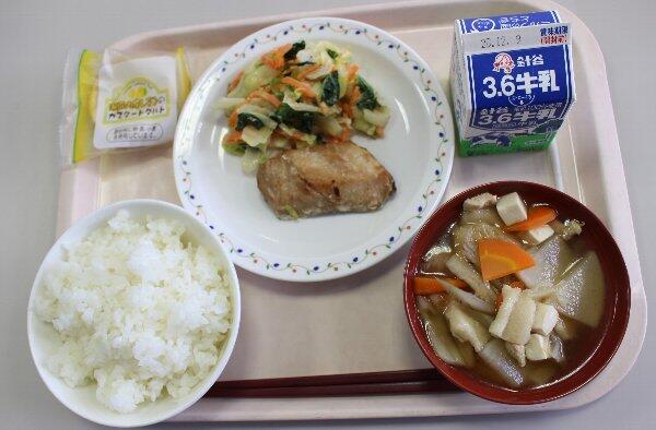 ごはん、牛乳、もろの照り焼き、じゃこあえ、いなか汁、県産乳ヨーグルト