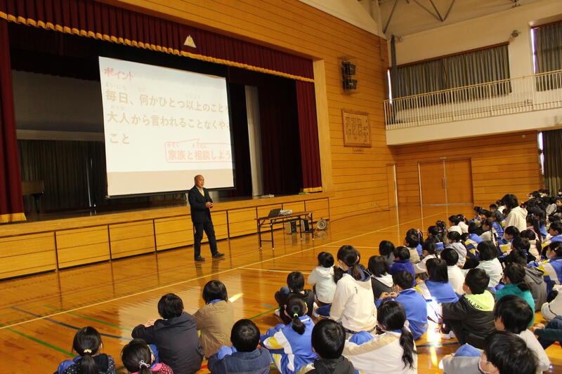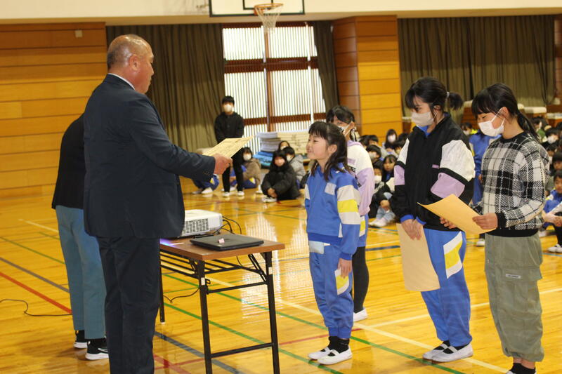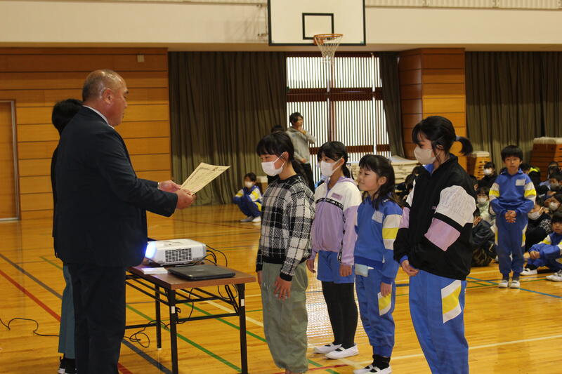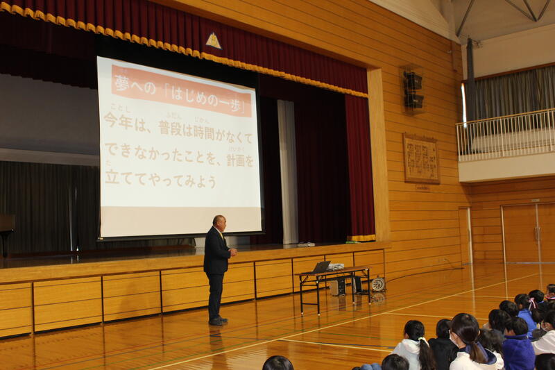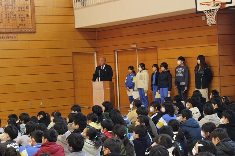 「3学期は短い期間ですが、目標をしっかり立てて頑張ってください。2学期終業式に出した宿題『何かを毎日やり続ける』は、達成できましたか?箱を用意しましたので、担任の先生から用紙をもらい、“冬休みにやりきった『じまん』できること”を書いて入れてください。校長講話で紹介したいと思います。1月1日におきた大きな地震の状況を見て、心を痛めています。でも、避難所で小学生たちが、施設での過ごし方や決まりを掲示したり、学校で習った運動をお年寄りの方とやっていた、ということを聞いて、とてもいいな、と思いました。皆さんも普段の勉強の内容を生活に生かしてください。それぞれの立場でできることをやってみてください。皆さんの活躍を期待しています。」