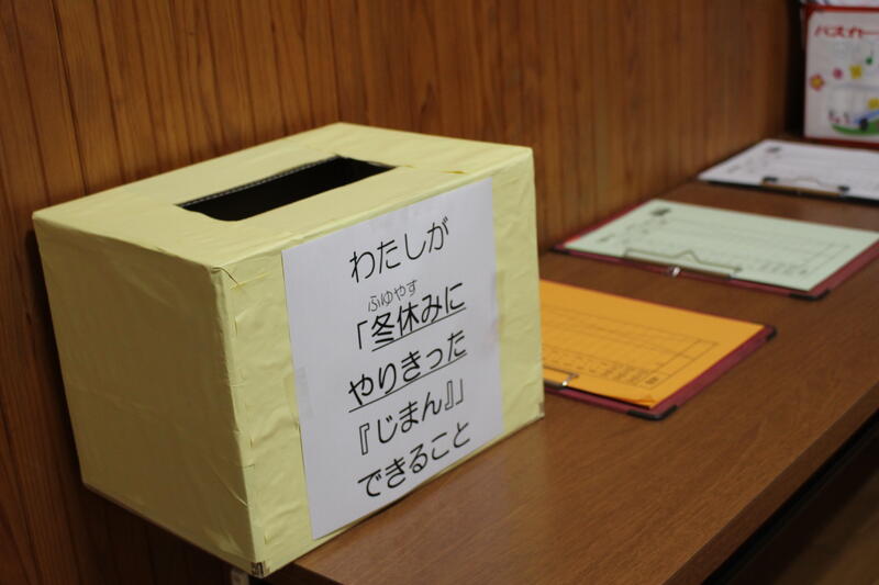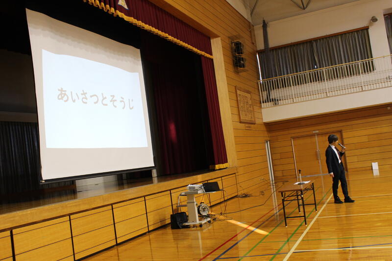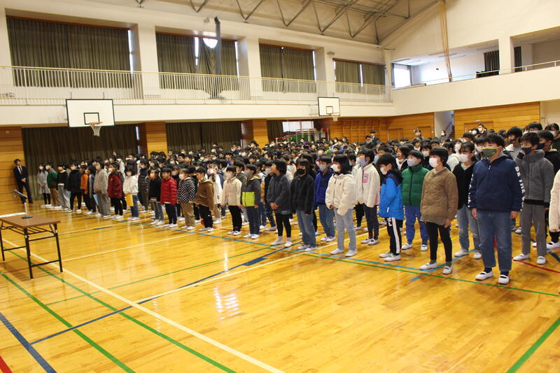 「3学期は短い期間ですが、目標をしっかり立てて頑張ってください。2学期終業式に出した宿題『何かを毎日やり続ける』は、達成できましたか?箱を用意しましたので、担任の先生から用紙をもらい、“冬休みにやりきった『じまん』できること”を書いて入れてください。校長講話で紹介したいと思います。1月1日におきた大きな地震の状況を見て、心を痛めています。でも、避難所で小学生たちが、施設での過ごし方や決まりを掲示したり、学校で習った運動をお年寄りの方とやっていた、ということを聞いて、とてもいいな、と思いました。皆さんも普段の勉強の内容を生活に生かしてください。それぞれの立場でできることをやってみてください。皆さんの活躍を期待しています。」