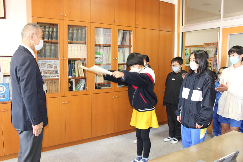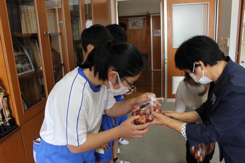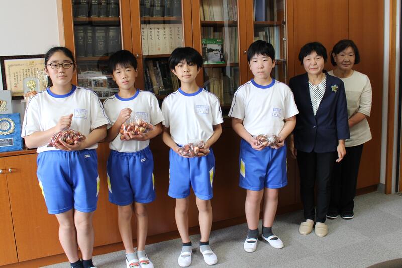更生保護女性会の皆様が来校し、チューリップの球根を贈呈していただきました!飼育栽培委員が受け取りました。きれいな花が咲くことを期待しています!!