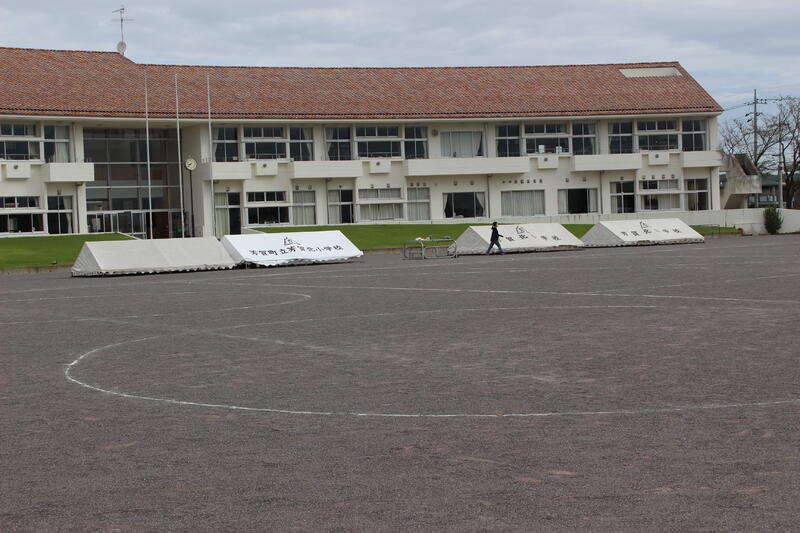 業間で避難訓練を実施しました。大きな竜巻発生を想定しての訓練でした。児童たちは紅白帽子をかぶって、すばやく避難できていました。
