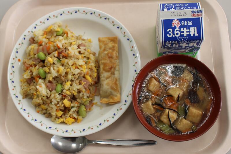 青菜としらすのチャーハン、牛乳、春巻き、中華スープ
