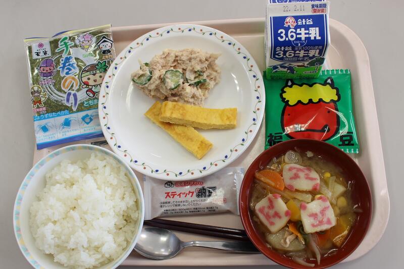 手巻き寿司(ツナ・玉子・納豆)、牛乳、のり、どさんこ汁、福豆